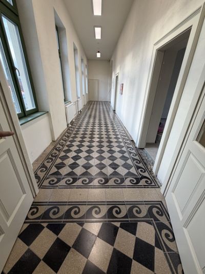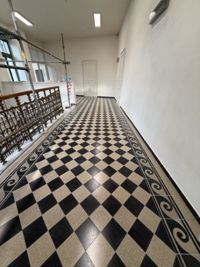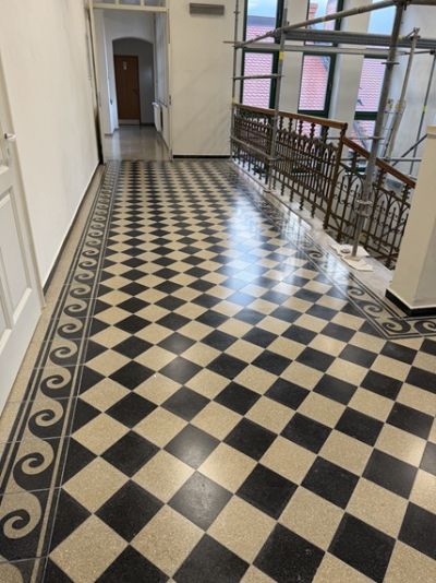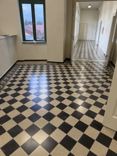 V minulém roce probíhala závěrečná etapa komplexní rekonstrukce budovy Městského úřadu ve Fiľakovu. Při této rekonstrukci historické budovy byl také požadavek na kompletní výměnu historické teracové dlažby v přízemí a v prvním patře, jak v hlavních halách, tak na chodbách. Požadavek od architekta byl na zachování nejen původní kresby dlažby, ale i technického provedení. Hlavní haly i chodby byly složeny se šachovnice bílá/černá o rozměru dlaždice 175x175mm a kraje byly provedeny netradiční bordurou, u nás pracovně nazývané šnek. Po schválení barvy obou teracových dlažeb byly vyrobeny formy pro výrobu uvedených dvoubarevných šneků. Že se nám rekonstrukce této historické podlahy povedla, je vidět z přiložených fotografií, které byly pořízeny po provedení posledního kroku, při realizaci teracové podlahy a to základní impregnací. Ta právě zvýrazní kresbu použitého kameniva a uzavře povrch podlahy proti vnikání vody a tím i provozní špíny.